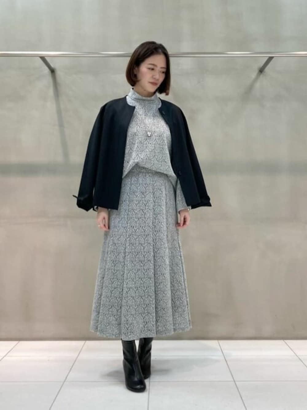 ウールレースのキレイめコーデです。 ライトグレーのレースの上下にノーカラーのジャケットを合わせました。 冬のイベントにもおすすめのコーディネートです。