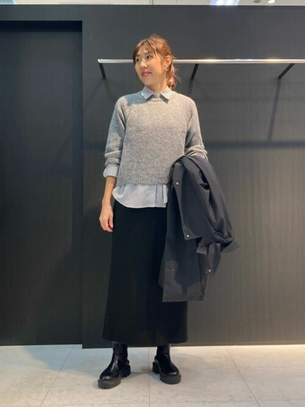 アルパカニットをレイヤードしたこなれ感のあるスタイリングです♪ ボリューム袖がポイント。 ジャージスカートで、甘さをプラスしてみました♪