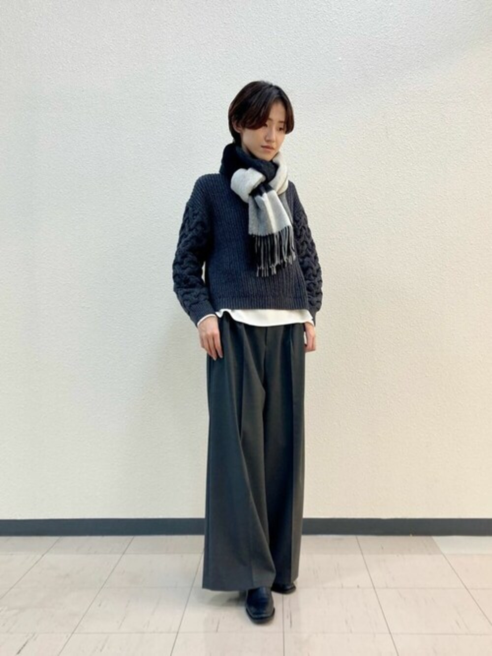 今季トレンドのグレーを取り入れて、今年らしく着こなしました。 ケーブルニットは綿素材を使用したお仕立てなので、気軽に秋気分を味わえます。 チェック柄のストールと合わせて、シンプルすぎないコーディネートにしました。