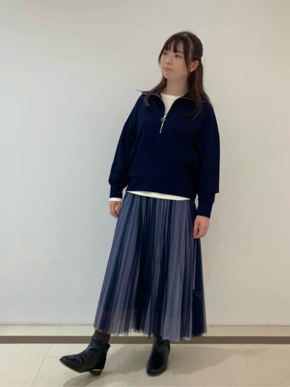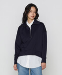 新作のコムサワードローブのハーフジッププルオーバーを使ったネイビーワントーンコーディネートです♪ 白のカットソーをレイヤードしてチラ見せする事で重すぎずネイビー1色をお楽しみいただけます! 丈はスッキリしているプルオーバーですが、ゆったりしてるので1枚でお召しいただくにも安心です。