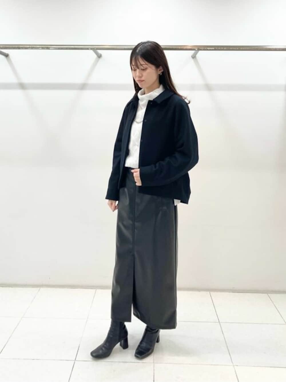 ケーブル編みのニットは、あまり厚手すぎないです。 少々透け感がありすので、インナーには長袖Tシャツを着用してます。 合成皮革のスカートは、驚くほどに柔らかいです!滑らかな触り心地を、ぜひ体感くださいませ。