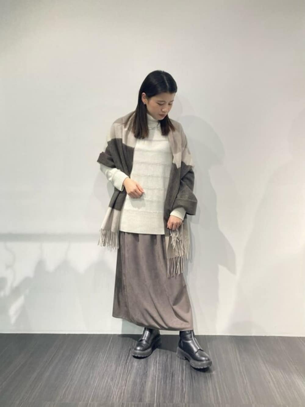 女性らしく、柔らかい印象に見えるコーディネートにしました。 着丈が長めのニットですが、裾はリブ編みになっていることで、スカートと合わせてもスッキリとした印象になります。 生地も柔らかくてチクチク感もなく、着心地が良いです◎
