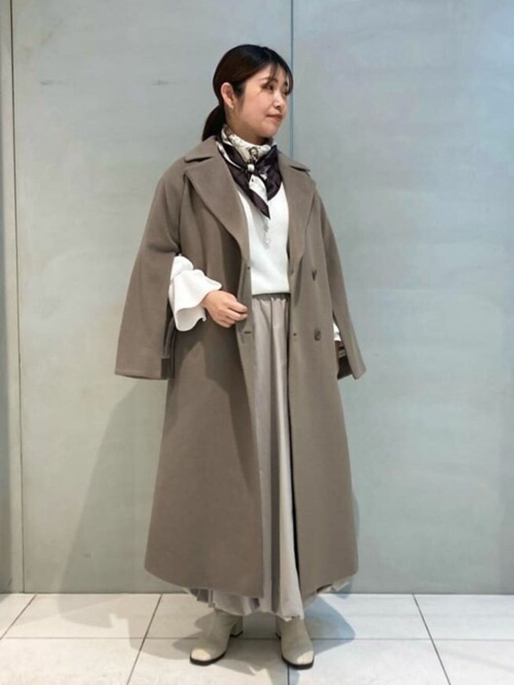 ロングコートに軽い素材感のアイテムを合わせた、春を意識したコーディネートです。 バルーンスカートは裾にしっかりボリュームがあるので、首元にトレンドのスカーフを巻くと軽さをだせます。 ニット、スカート共にゆったりしたサイズ感ですが、生地が薄手なので、コートの下でもすっきり着られます。