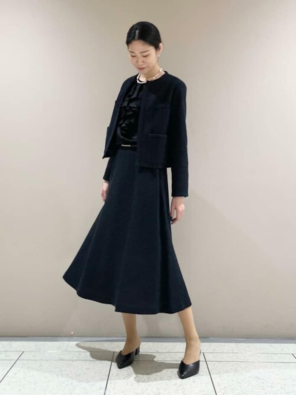 シックなセレモニースタイルのご紹介です。 ◾️ノーカラージャケット 【サイズ感】 着丈50cmとコンパクトですが、身長168cmでも短過ぎずにお召しいただけます。 【素材感・着心地】 ツイードですが、麻に似た風合いの綿の糸を使用しているため軽い着心地です。 ◾️フレアースカート 【サイズ感】 ウエストの後ろがゴムになっており伸縮性があります。 細いベルトを通すことができる糸ループがついており、ベルトがズレないのもおすすめポイントです!