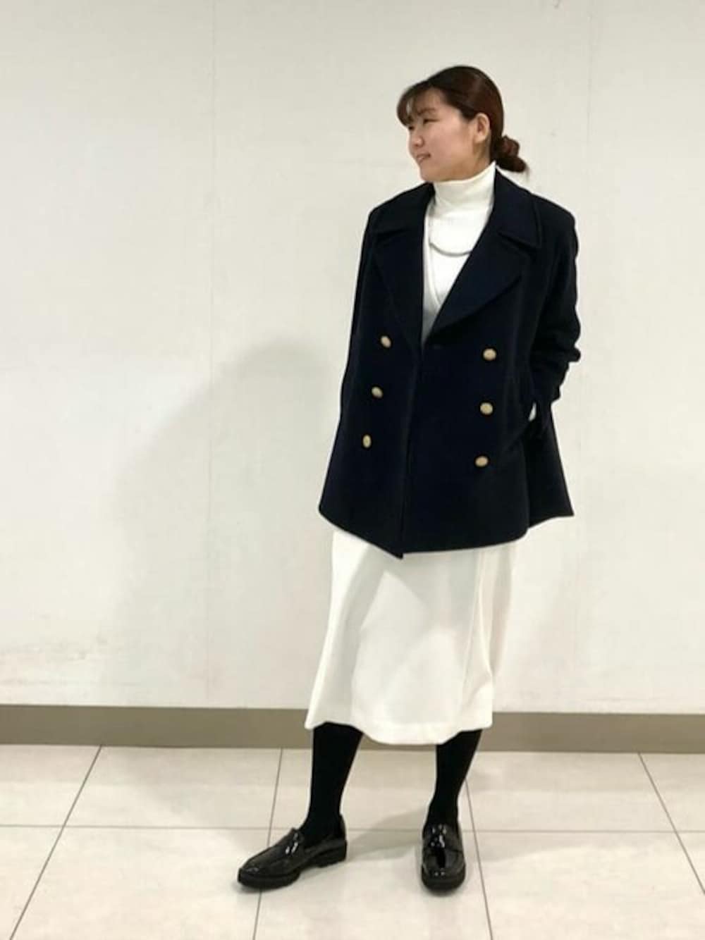 ホワイトのワントーンコーデにトラッド感あるPコートを合わせました。 [Pコート] 厚手のニットやジャケットを合わせても袖周り、見頃共にゆったりお召しいただけます。 横にファスナーがついており、着こなしのアクセントになります。 [ジャンパースカート] トリアセ混のサラサラ素材なので夏手前までご活用頂けます。 ゆったりお召しいただけ、ラインが気になりにくくスタイルアップして見えます。