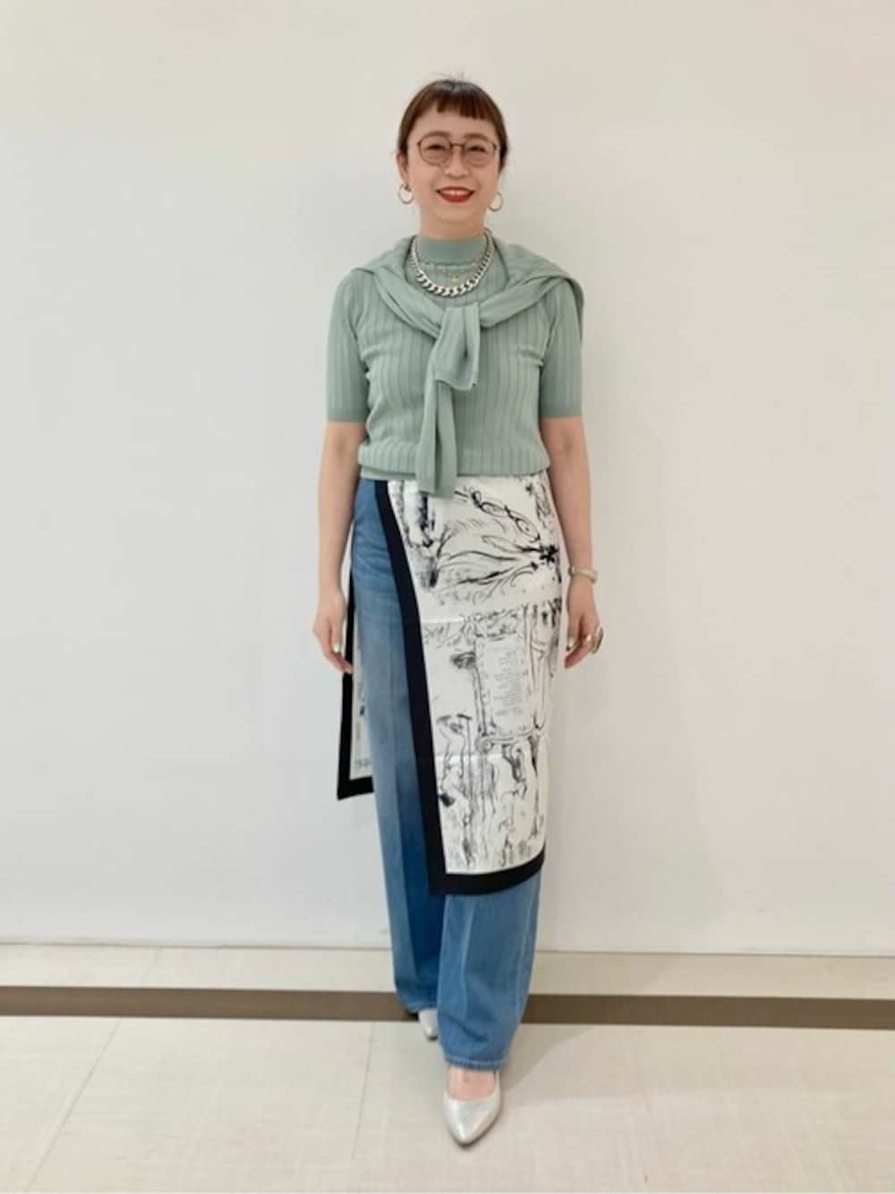 春カラーのニットとデニムのシンプルなスタイリングに、スカーフを巻きスカート風に合わせた、休日スタイルです。 とても柔らかな履き心地のデニムは、ウエスト部分も圧迫感がなく、ボディラインも響かないので、短めトップスを合わせても安心♪ 161センチの私でちょうど良い丈です。 ニットは首元も高すぎず、5分袖なので、オンオフどちらでも着やすいです。