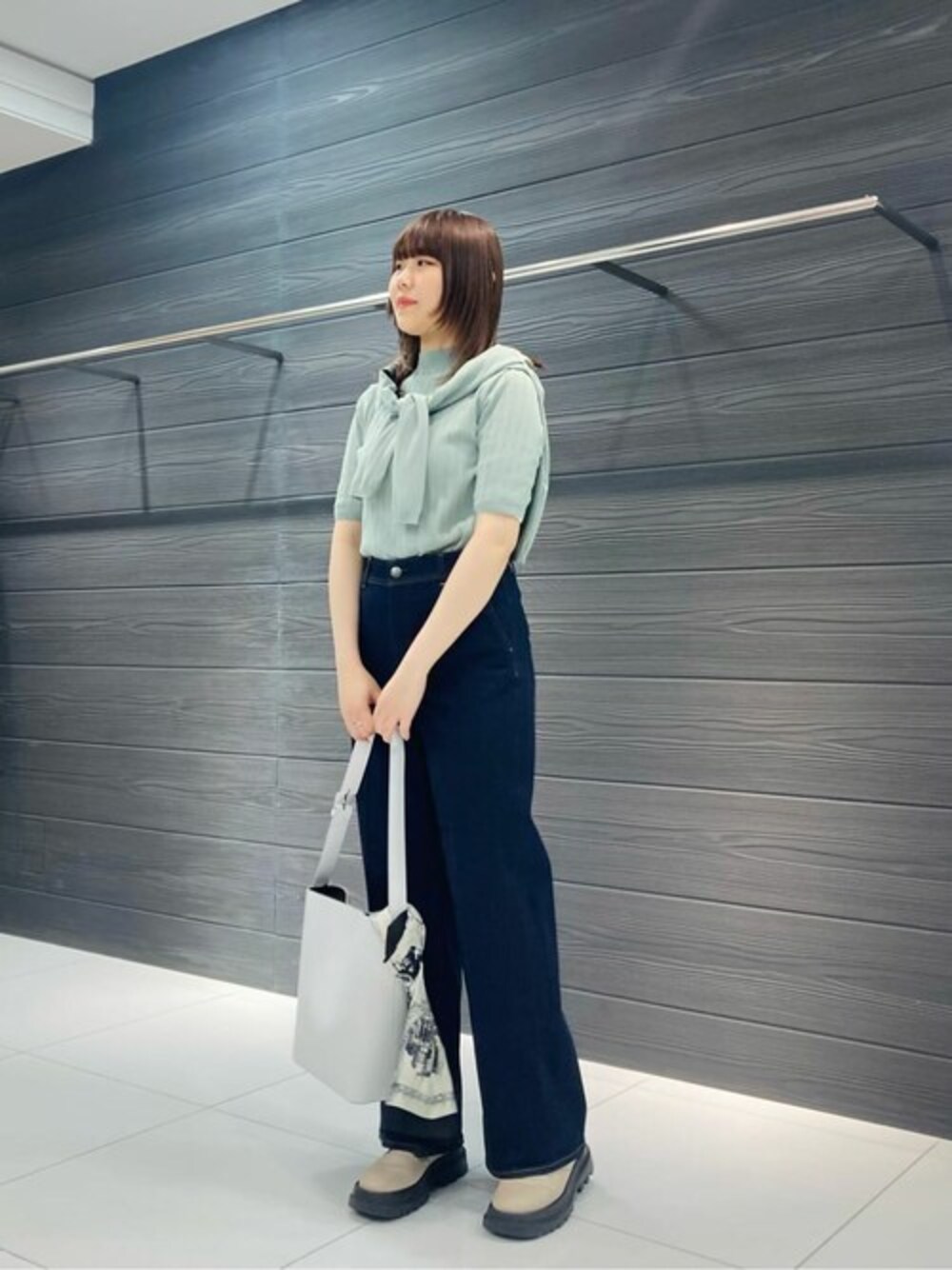 ニットプルオーバーは、体のラインを拾いにくい素材感で、 リブの縦ラインが上半身をスッキリ見せてくれます。 袖丈が少し長めなので、二の腕を気にせずお召しいただけます。 カーディガンは、ボタンを留めて一枚で着てもおしゃれです。 デニムは、柔らかさとストレッチ性で履き心地抜群です。 ハイウエストなのでスタイル良く見せてくれます。 バッグは、どのコーディネートにもぴったりなデザインでおすすめです。
