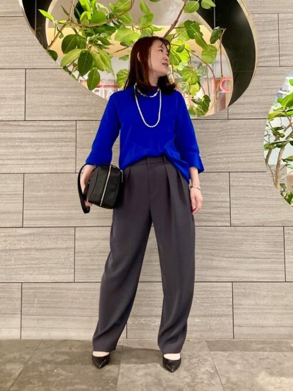 鮮やかなブルーが目をひくニットのコーディネートです。 シンプルなアイテムなので、アクセサリーやバッグで華やかさを出しました。 ・ニット 鹿子編みで肌への接着面が少なくサラッとしているので、初夏まで長く着てきただけます。 腕まわりや見頃はピタッとしすぎないので身体のラインが出過ぎないので安心です。 ・パンツ ぷるんとした肉感のある素材で程よい落ち感もあり、身体のラインやを拾いにくい素材です。 穿くだけで旬なシルエットが叶います。