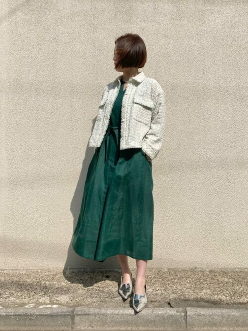 ■ツイードシャツ 【サイズ感】 ・全体的にゆったりとしています。 ・着丈短めですが後ろが少し長めになっていてボトムとのバランスが取りやすいと感じました。 【素材感・着心地】 ・ツイード特有の凹凸感があり肌離れが良いです。 ・重いツイード羽織りではなく、軽くてシャツ感覚で着られます。 ■ラミーシャツドレス 【サイズ感】 ・全体的にゆったりしていて着丈も長めです。 ・付属のインナーワンピースは少しだけタイトめに感じました。 【素材感・着心地】 ・ラミー特有の張りがあり、薄くて軽くて涼しい素材です。 ■スタイリングポイント 旬なツイード素材×麻のワンピースで季節の変わりめを感じるコーディネートにしました。