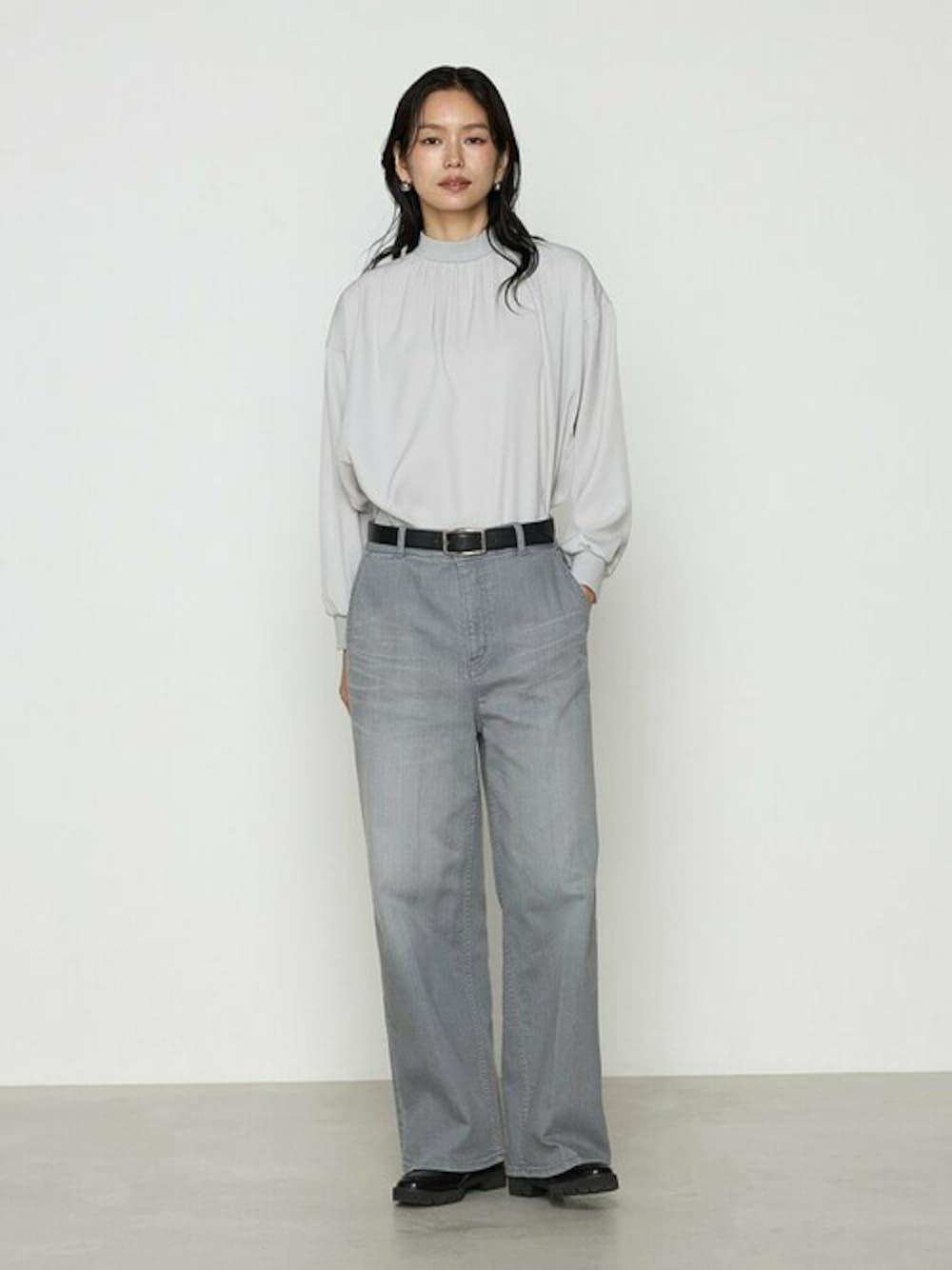 《デザイン》 K.T定番のエフォートレスな分量感でつくるリブギャザープルオーバーです。 前年より首と袖口のリブを低くし旬のハイネックを追求しています。 首部分のもたつきを解消させ、より顔回りもすっきりな印象です。 フェミニンなギャザーブラウスを編みたてのリブできりっと仕上げています。 スリーブは、ボリュームスリーブで、袖口リブは長めのデザインでお好みで折り返して着られます。 シャツテールできれい目な印象です。 前だけインなど、着まわしアレンジが利きます。 胸元はたっぷりのギャザーでボリュームをだし、肩回りはタックで分量をコントロールしています。 ビッグシルエットながらもコーディネートがすっきりきまるブラウスです。 《素材》 表面のなめらかさとストレッチ感が特長のスエード調サテンです。 微起毛により寒い時期から着られる嬉しい素材です。 透けにくく程よい肉感で一枚で着ても安心です。 01:ホワイト…シンプルできれい目なベーシックカラーです。 04:ライトグレー…こなれ感のあるニュアンスグレーです。 (K.Tオリジナルカラー)23:サックス…春を感じさせるさわやかなブルーです。 (K.Tオリジナルカラー) 05:ブラック…モードで気品あふれるカラーです。