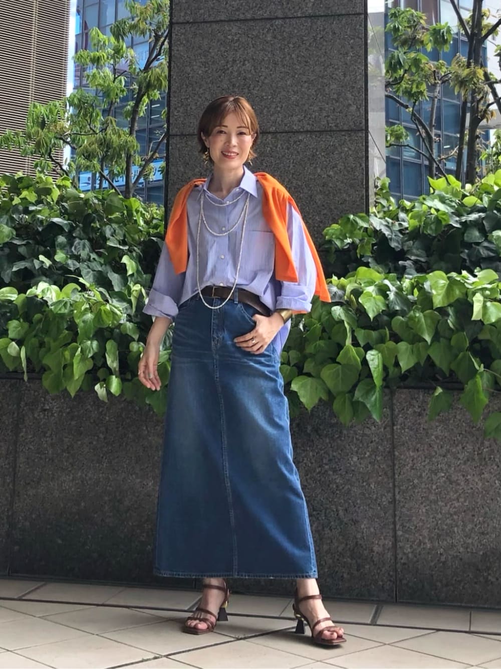 ▪️シャツ 【着心地・サイズ感】 綿100%で肌触り抜群のハリ感とナチュラルな風合いの素材で通年でお召しいただけるシャツになります。 サイズはゆったりしたリラックスシルエットです。開けて羽織っても夏の冷房避けにも最適です。 ▪️デニムスカート 【着心地・サイズ感】 ストレッチなしの11オンスのしっかりした生地感でボディラインを美しく見せてくれます。 タイトシルエットではありますが、足捌きの良さとタイト見えのバランスが良く後ろのベントで動きやすいです。 ▪️コーディネートポイント 差し色にオレンジを使ってこれからの季節にぴったりなカラーコーディネートです。 それぞれのアイテムがお手持ちのアイテムに合わせやすく単品使いしやすくなってます。