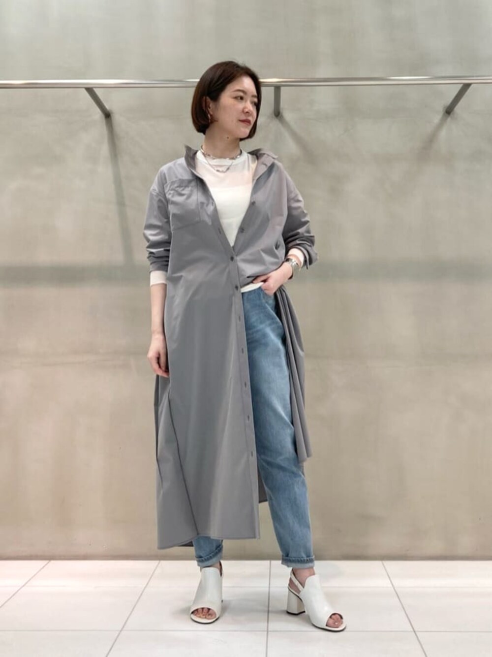 ■タフタシャツワンピース 【サイズ感】 ・私の体型だとタイト過ぎず、ゆったり過ぎないちょうど良いサイズに感じました。 ・前ボタン、後ボタンでデザインが変わる仕様ですが、前で留めると少しタイトめです。 【素材感・着心地】 ・タフタ特有の薄くて軽く適度なハリがあります。 ・かなり軽量で伸縮性があります。 ・今回のようなボトムと重ね着での着用の場合、相性によっては滑りが若干悪いのでボタンを開けるなどの調節が必要です。 ■シアーカットソー 【サイズ感】 ・タイトではないですがかなり薄い素材なので体に沿うイメージです。 ・首元は鎖骨がちょうど隠れるくらいの開き具合です。 【素材感・着心地】 ・綿100%で着心地が良いです。 ・かなり透け感があるのでインナーに気をつける必要があります。 ■デニム 【サイズ感】 ・ウエストはゴムと紐で調節できるので私の体型だとかなりゆとりがありました。 ・股上深めで安心感があります。 ・身長160センチで10分丈くらいです。(写真は1回折り返してくるぶしくらいにしています) 【素材感・着心地】 ・夏も着用できる適度な厚さの生地感です。 ・デニムのがっしりしたイメージがなく軽いはき心地です。 ■スタイリングポイント ロングシャツを春らしく明るいトーンでコーディネートしました。 ワンピース1枚でシンプルにデザインを楽しんでから、アイテムをプラスしてアレンジしていただくと長い季節楽しめます。