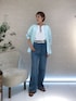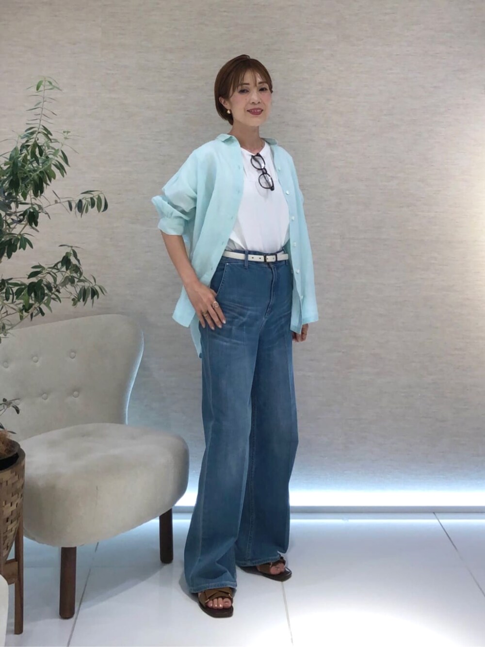 ◾️シャツ9号 【サイズ感】 袖付けがドルマンになっているので腕周りがゆったりと着やすいです。着丈も後ろが長くなっているのでヒップ周りをカバーしてくれ細めのテーパードパンツなどに合わせても良いです。 【素材感・着心地】 ラミー素材でシャリ感のある涼やかな素材です。ふんわりととても軽く夏の冷房対策や、日よけにもぴったりです。 ◾️デニム9号 【サイズ感】 センタープレスのはいったワイドデニムパンツです。 足の形を拾うことなくスッキリと見せてくれます。 ウエストは少し大きめですが、腰位置で問題なくお召しいただけます。大きくてもベルトで調整出来ます。 着丈は長めです。身長166センチでヒールなしで床につかないくらいの着丈です。 【素材感・着心地】 デニムなのに柔らかくストレスなくお召しいただけます。 生地の厚さはオールシーズン着られるデニムです。 ◾️コーデのポイント ミントグリーンのシャツが主役のコーディネートです。 ベルトも白で爽やかな色合わせにしてみました。