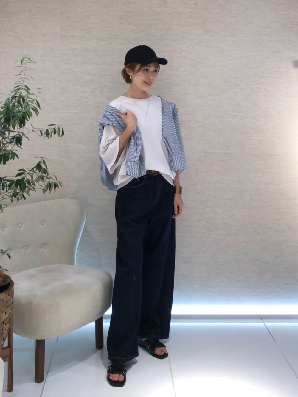 ◾️カットソー9号 【サイズ感】 ゆったりとしたビッグシルエットで袖幅も広いのでカジュアルにゆるっと着られます。 【素材感・着心地】 肌あたりの優しいコットンを使っており、とても柔らかい着心地です。 ◾️デニム9号 【サイズ感】 ウエスト周りは程よくフィット、カーヴィシルエットで今年らしいデニムです。 着丈もそこまで長くなく裾幅も狭くなっているのでスッキリお召しいただけます。 【素材感・着心地】 オールシーズン着られる厚さのデニムです。 生地も柔らかくとてもはきやすいデニムです。 ◾️コーデのポイント ゆるっとビッグシルエットのカットソーにカーヴィデニムでカジュアルコーデにしました。 ストライプのシャツをアクセサリー感覚で肩がけしてポイントにしました。