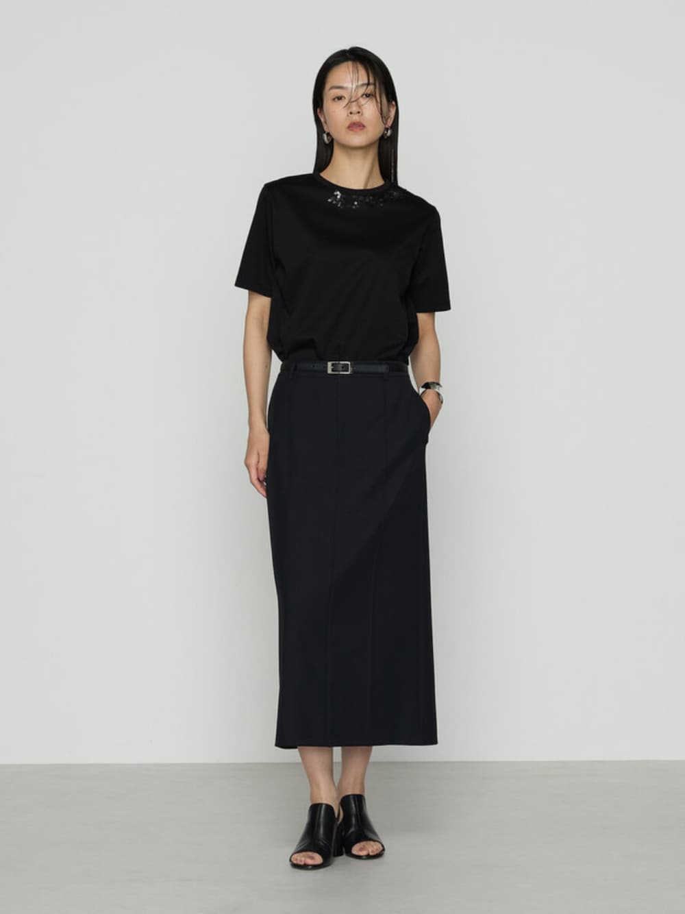 《デザイン》 襟元にスパンコール刺繍をあしらったTシャツです。 襟ぐりにアシンメトリーに配置しているので、モードな印象です。 穴の位置が中心ではなく少し上にあるスパンコールを使用しているので動くたびに揺れて抜け感があります。 スパコールを生地と同系色にすることで、光沢の華やかさがありながらもアクセサリーの邪魔にならない、オフィスカジュアルにぴったりの優れものの一枚です。 ジャケットインしやすいようにアームホールや着丈をコンパクトなサイズ感にしています。 特にストレッチからみのジャケット(商品番号:15-06GK05-205)ジレ(商品番号:15-06VK08-205)に合うように作っています。 《素材》 スーピマコットンを使用したハイゲージで編み立てたポンチです。 糸自体に含まれる油分による、しっとりとした肌触りが特長です。 余分な毛羽を取り除き、強シルケット加工で光沢を引き出しています。