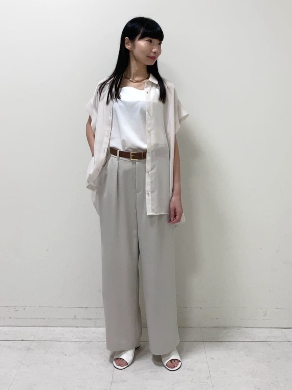 ◼︎半袖シャツ 着用サイズ9号 【サイズ感】 •ゆるくAラインになっており、長めの着丈でお尻周りまでしっかりカバーしてくれます。 【素材感•着心地】 •透け感と清涼感のある素材なので通気性がよく、夏にぴったりです。 ◼︎キャミソール 着用サイズ9号 【サイズ感】 •肩ひもは下着より少し太めに作っているので安心感があります。 前後どちらでも使える2wayです。 【素材感•着心地】 •シルクのような光沢感があります。肌に触れる部分は滑らかなので着心地が良いです。 ◼︎ワイドパンツ 着用サイズ9号 【サイズ感】 •程良いワイドですっきりして見えます。 後ろがゴムなので履き心地が良いです。 【素材感•着心地】 •透け感がある素材で裏地が膝下くらいまであります。 ◼︎ネックレス 【サイズ感】 •大きめで、ゴールドが目立ってアクセントになって良かったです。 •好きな長さに調節出来ます。 【素材感•着心地】 •合金で、少し重たく感じました。 ◼︎ベルト 【サイズ感】 •丁度良い太さです。 【素材感•着心地】 •表側は牛革で丈夫です。 •金具がゴールドなので、ゴールドネックレスと合わせると統一感があり良いです。