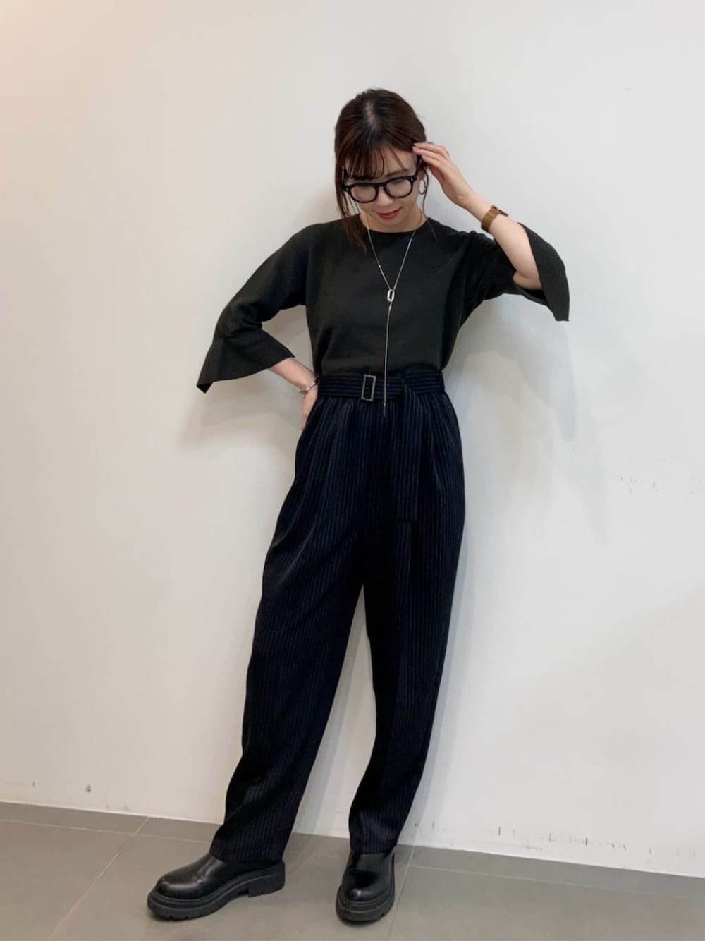 《デザイン》 ぐるりゴムでイージーな履き心地がありつつ、 センタープレスを入れることできちんと感があるワイドパンツです。 タックとギャザーでヒップに張り付かず、ふくらみを高い位置で保ち、ヒップを高く見せてくれます。 ストライプの柄で縦のラインを強調する効果と相まって 脚を長く見せる効果が期待できます。 共地ベルト付きでゴムギャザーを隠し、よりきれいに見える仕上がりです。 15-03VI03-204とのオールインワン風や、 15-03HI03-204のブラウスアップの新鮮な着こなしはもちろん、 単品としても使い回しやすい便利なアイテムです。 パンツのみ無地黒(カラーNO.55:ブラック系その他)も展開しています。 《素材》 トリアセテートの上品な光沢のサテンでつくったマニッシュなグレーとブラックのピンストライプの生地です。 サテンの艶とトリアセテート特有の色の深みによるグレード感は、 国産ならではの繊細で上品な仕上がりです。 マニッシュなピンストライプにしなやかな質感、 適度な張りとドレープ感を兼ね備えた生地なので、 フェミニンさがプラスされ、モードな大人の甘辛ミックスが叶う素材です。 表側はサテンの滑らかな肌触り、 裏側はカリッとしたタッチなので、 ドライな着心地で肉感がありながらも軽やかに着られます。 多忙なキャリアにぴったりの、 しわになりにくく、イージーケアで嬉しい素材です。