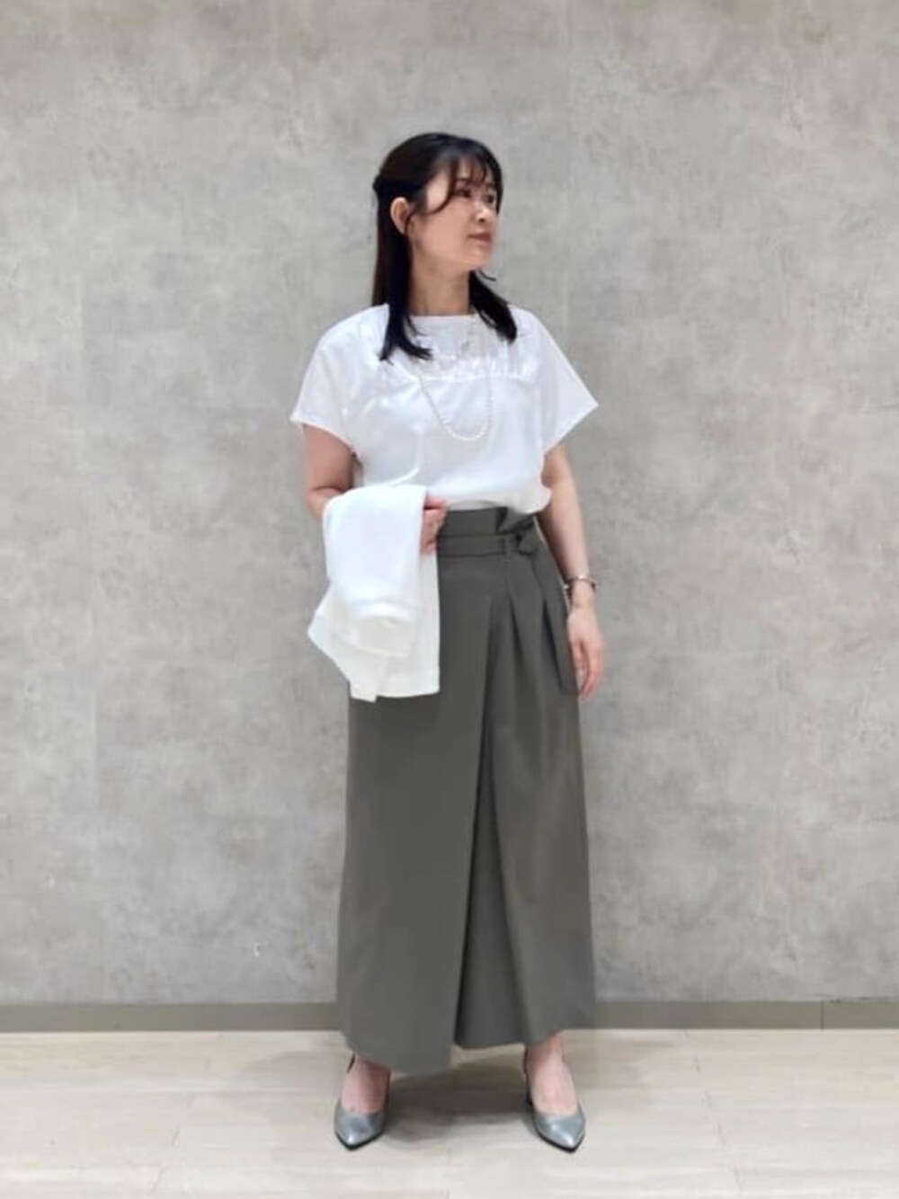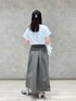 ■Tシャツ 着用サイズ9号 【素材感・着心地】 とても柔らかく、さらっと着れる素材です。 【サイズ感】 肩や胸周りはゆとりがあります。 身体に張り付かないサイズ感で夏に涼しく着れそうです。 ■スカート 着用サイズ9号 【素材感・着心地】 撥水加工で雨の日でも安心です。 ストレッチが効いているので長時間座ったりしても窮屈感が無い素材です。 【サイズ感】 ウエストは少しゆとりがありますがベルトで調整できます。 ■コーディネートポイント 撥水加工のスカートで濡れても安心コーデ。 パールの重ね付けで華やかさを出しました。 雨の日や夏のレジャーでも綺麗めコーデを楽しみたい!と考えたコーディネートです。