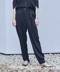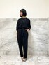プルオーバー 《デザイン》 ぽわんとした立体的な袖が特長的なプルオーバーです。 袖はダーツでふくらみを出すことで、ストライプの柄をなるべく途切れないように、きれいに見えるようこだわっています。 見返しを無地のサテンにすることで、スリットから見える内側も美しく見えるように仕上げました。 また、表地と見返しに芯を貼り、張りを持たせることで、 袖のフォルムを美しく保っています。 裾は前後差をつけ、シャツテールにすることで、前だけインしやすいようにしています。 後ろはお尻まで隠れる安心感のある着丈です。 脇線をなくし、前に回り込ませることでヒップの横ハリをさりげなくカバーしてくれます。 小さめな襟ぐりで上品さを出し、後ろの開きはメタルのドットにすることでキリッとしたポイントにしています。 脇線を前に振り、テールにつながるラインとストライプの柄が相まって程よいゆとりがありつつすっきりと見える仕上がりにしています。 ワイドパンツ 《デザイン》 ぐるりゴムでイージーな履き心地がありつつ、センタープレスを入れることできちんと感があるワイドパンツです。 タックとギャザーでヒップに張り付かず、ふくらみを高い位置で保ち、ヒップを高く見せてくれます。 ストライプの柄で縦のラインを強調する効果と相まって脚を長く見せる効果が期待できます。共地ベルト付きでゴムギャザーを隠し、 よりきれいに見える仕上がりです。