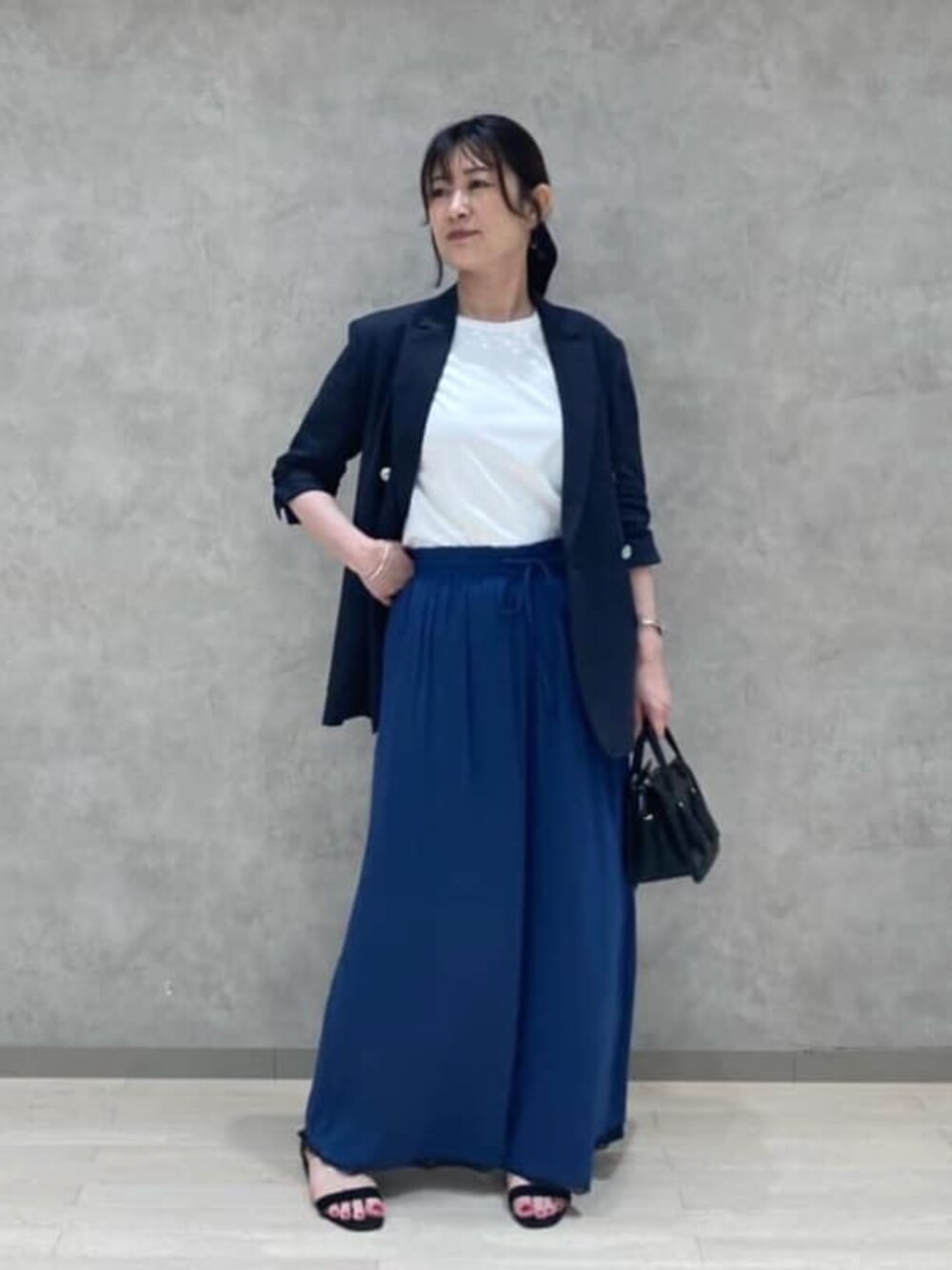 ■ジャケット 着用サイズ9号 【素材感・着心地】 軽くて、ストレッチも効いているのでジャケットでも窮屈感なく着れます。 透け感もあり真夏に着れるジャケットです。 【サイズ感】 程よいゆとりで9号でちょうど良いです。 ■スパンコール刺繍Tシャツ 着用サイズ9号 【素材感・着心地】 綿100%でサラッとした素材感で着心地良いです。 【サイズ感】 ジャケットなど羽織りのインナーにしやすいスッキリしたサイズ感です。 袖丈もしっかりあるので1枚で着ても安心です。 ■カッセンプリーツパンツ 着用サイズ9号 【素材感・着心地】 プリーツ面は柔らかく優しい肌触り、シャンブレーカッセン面はドライタッチでサラッとした肌触りです。 ウエストゴムで締めつけ感もなく着ていただけます。 【サイズ感】 ウエストのゴムとドロストで調整できます。 丈は160㎝の私はちょうど良いと感じました。 ■コーディネートポイント ボトムにカラーを効かせたお仕事スタイルです。 インナーにスパンコール刺繍のTシャツを入れアクセサリー無しでも華やかに着れるコーディネートにしました。
