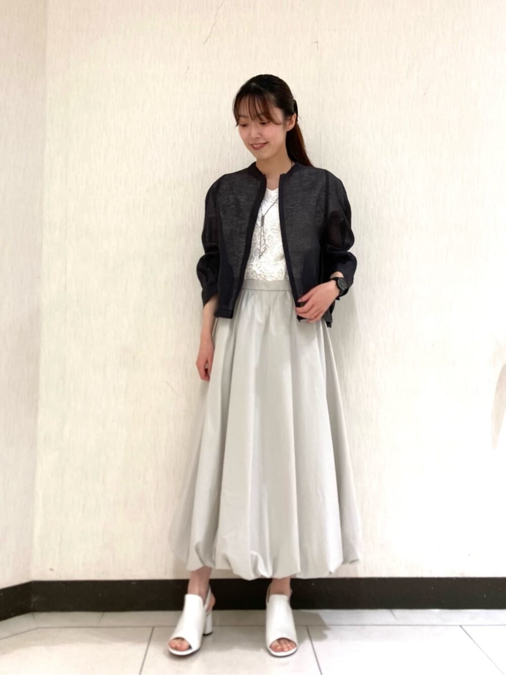 ■ブルゾン 【サイズ感】 程良いボリューム感を持たせたこだわりのシルエットです。 【素材感・着心地】 麻と綿を使った素材なので暑い時期にも涼しく羽織っていただけます。 肌との接触面が少ないため風通しも良く軽い着心地です。 ■ブラウス 【サイズ感】 浅めのVネックですっきり見えします。 【素材感・着心地】 レース生地ですが裏地が付いているため透け感を気にせず一枚でお召しいただけます。 丈は少し短めなのでインせずともすっきりとしコーディネートのバランスが取りやすいです。 ■スカート 7号 【サイズ感】 ウエスト前はベルト仕様できれいめに、 後ろはゴム仕様のためジャストサイズでお召しいただけます◎ 【素材感・着心地】 見た目のボリューム感はありますが履いてみるととても軽く涼しい素材です! シンプルになりがちな夏のコーディネートにプラスするだけで一気におしゃれ見えします◎ ■スタイリングポイント ボリュームのあるバルーンスカートにコンパクトなブルゾンを羽織ってスタイルアップを意識したコーディネートにまとめました◎ インナーにはあえてレースのブラウスを合わせて上品さをプラスしました。 カジュアルなTシャツやカットソーを合わせても
