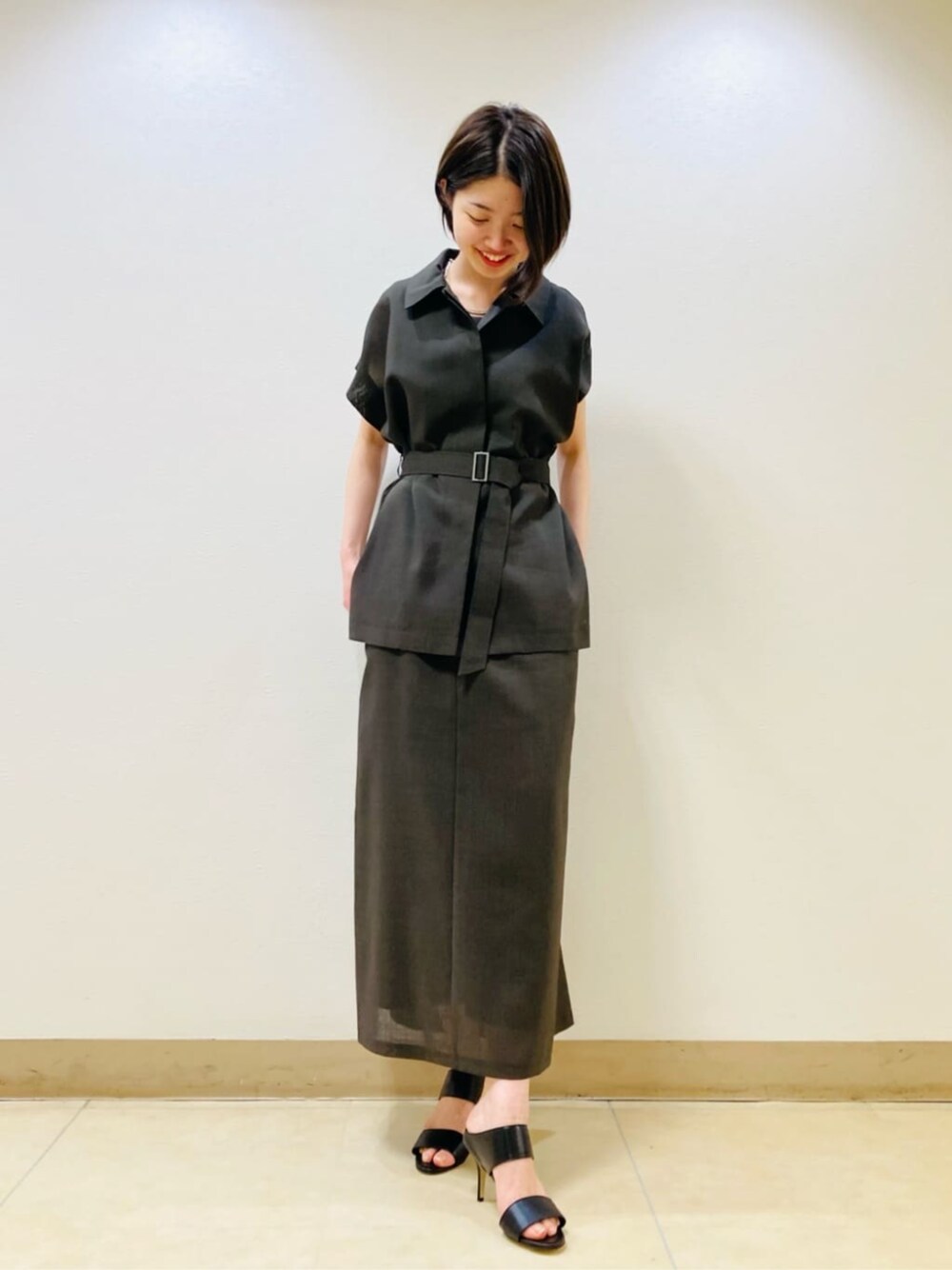 ◯シアーボイルジレ 【サイズ感】 ※写真は11号サイズを着用しています。 ・袖は肩から少し落ちます。 ・前を開けてジレとしても活用できます。 ・お尻にかかる丈です。 【素材感・着心地】 ・ポリエルテル100%なので、さらっとお召しいただけます。 ・肌離れも良く汗をかいても快適に過ごせます。 ◯シアーボイルスカート 【サイズ感】 ・足首上くらいの丈です。 ・ウエスト後ろがゴムになっているので、着脱がしやすいです。 【素材感・着心地】 ・後ろにスリットが入っているので、足捌きがしやすいです。 ・ジレと同じ素材で肌離れがいいです。 ◯サンダル 【サイズ感】 ・Mサイズを着用しています。 ・普段23.5〜24.5cmを履いてますが、ちょうど良いサイズです。 【素材感・履き心地】 ・9cmの少し高めのヒールです。 ・甲にしっかりとしたベルトが付いているので、安定感があります。 ◯スタイリングポイント 夏場に涼しいシアーボイルのセットアップできれいめのコーディネートです。 ブラウンの色味もシアー感で重たい印象にもならずお召しいただけます。
