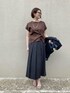 ■タックTシャツ 着用サイズ9号 【サイズ感】 ・着丈短めでボトムインぜすにそのまま着られてバランスがとりやすいです。 ・私の体型だと背中周りと袖口に少しゆとりがある印象です。 【素材感・着心地】 ・着心地はフィット感があまり無く、ゆとりを感じますが、見た目は多少タイトですっきりなシルエットになります。 ・背中周りにゆとりがあって着やすいです。肌離れがよく夏におすすめです。 ・さらっとした素材感ですが薄過ぎず透けにくいです。(色違いの白は少し透け感があります) ■ドットプリーツスカート 9号 【サイズ感】 ・ウエスト総ゴム仕様で楽にはける印象です。 ・ウエストのゴムがキツ過ぎないのが嬉しいポイントです。 【素材感・着心地】 ・適度な薄さの生地感ですが裏地付きで3シーズン(春夏秋)は着用できそうです。 ・サラサラしていて軽く、シワになりにくい素材です。 ■スタイリングポイント 旬なブラウンのTシャツをダークトーンでまとめたきれいめコーデです。