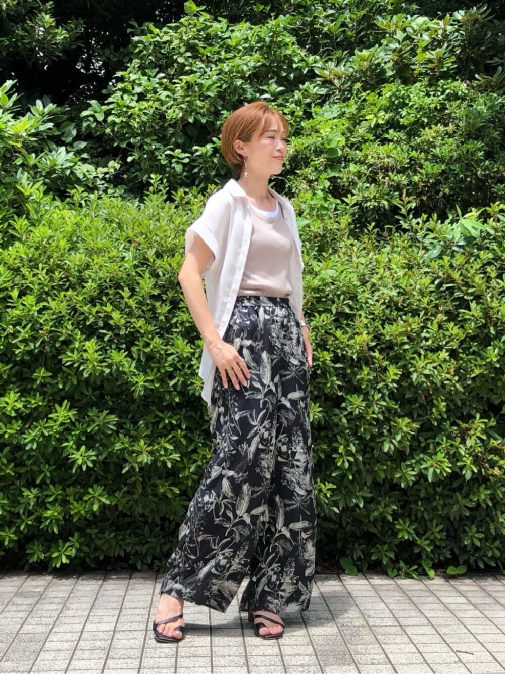 ◾️シャツ 【サイズ感】 緩やかなAラインのシルエットで、腕周りもゆったりとしていて体のラインを拾わずこれからの季節にぴったりです。 長さは後ろが長く身長166センチでヒップが全部隠れるくらいの長さです。 【素材感・着心地】 ドライなからみ織りのシアーシャツなので、インナーで雰囲気を変えられます。 シワにもなりにくくとにかく軽い着心地です。 ◾️パンツ 【サイズ感】 ウエストはゴムとドロストで調節可能です。長さは少し長めになっておりますがウエスト位置を調節していただけます。 【素材感・着心地】 麻調のサラッとした着心地でシワになりにくい、速乾性があり足にまとわりつくことなく着心地がとてもよいです。 ◾️コーデのポイント ボタニカル柄が主役のシンプルコーディネートです。 シャツもパンツも着心地がとにかくよいので暑い時期にピッタリです。