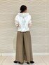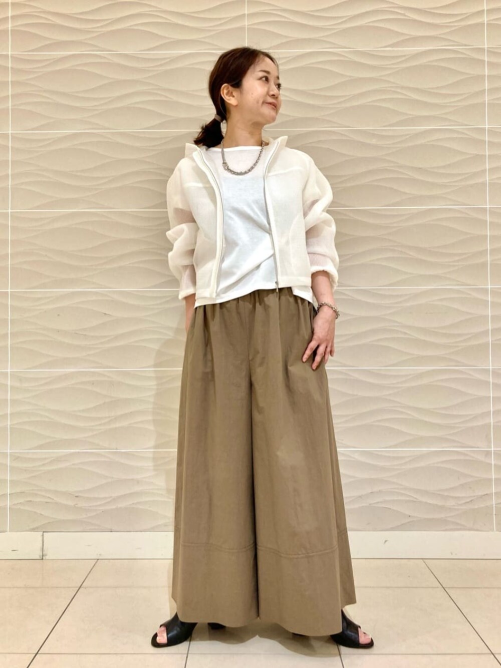 ◼︎ブルゾン 【サイズ感】 アームはゆったりしていて肌離れしているので涼しく着て頂けます。 【素材感•着心地】 透けすぎず、前と後身頃で透け感が違うので シアーが苦手な方にもオススメです。 ◼︎Tシャツ 【サイズ感】 程よい丈感でワイドパンツやスカートに合わせやすいです。 【素材感•着心地】 コットン100%で肌触りがいいです。 生地がしっかりしているので透けにくいところもおすすめです。 ◼︎ワイドパンツ 【サイズ感】 幅広めで肌離れしているのでリラックスして着て頂けます。 【素材感•着心地】 コットン100%でハリ感とソフトな風合い。 生地がとにかく軽くエアリーな素材感です。 キャメル、チャコールは裏地無しで透け感なく着て頂けます。 ◾️コーディネートポイント 今年の夏を涼しく快適にお洒落にをテーマにコーディネートしてみました。 シンプルですが、トレンド感も出しつつ手に取りやすいアイテムです。 #K.T キヨコタカセ #ギャバジンK.T #手洗い可能 #旅行 #パンツコーデ #大人か