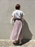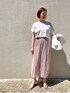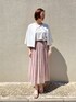 ■ポコポコブルゾン 【サイズ感】 ・前身頃短めでコンパクトな印象ですがゆったり着られます。 ・私の体型でちょうど肘が隠れる袖丈です。(ワンロールすると肘が見えます) 【素材感・着心地】 ・ポコポコした生地が肌離れがよく涼しく着られる印象です。 ・綿混で肌触りがよく、軽量です。 ■ビスチェ風カットソー 【サイズ感】 ・ドルマンスリーブで袖周りにゆとりがあります。 ・全体的に身体のラインをひろわないサイズ感です。 【素材感・着心地】 ・しっとりと柔らかい肌触りです。 ・ほど良い生地感で着用したグレージュは透け感をあまり感じませんでした。 ■ラミープリーツスカート 9号 【サイズ感】 ・ウエスト総ゴム使用で楽にはける印象です。 ・細かいプリーツが入っているのでウエストからふんわりAラインに広がります。 【素材感・着心地】 ・ハリのあるラミー素材で薄い生地感ですが透け過ぎていない印象です。 ■スタイリングポイント ピンクのプリーツスカートを主役にしたきれいめコーデです。 グレージュのTシャツで少しカジュアルダウンさせました。