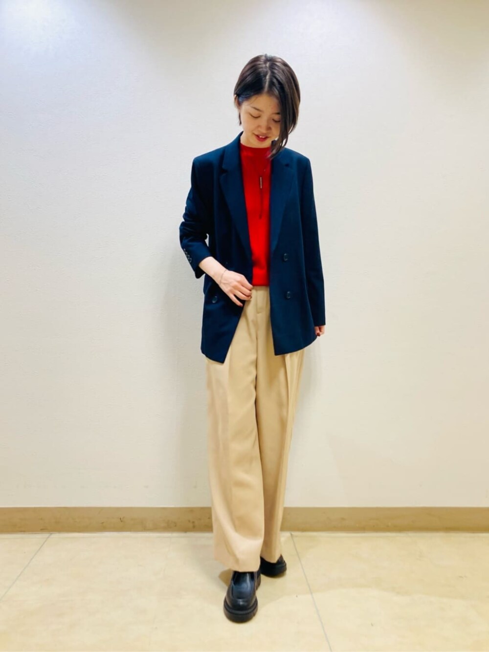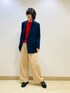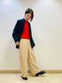 ◯ダブルジャケット 着用サイズ9号 【サイズ感】 ・ダブルジャケットなので、身頃にゆとりがあります。 ・ニットを着て余裕があります。 【素材感・着心地】 ・ネイビーベースにボルドーのラインが入っています。 ・見た目よりも軽い着心地です。 ◯ニット 着用サイズ9号 ※インナーのみ着用 【サイズ感】 ・パンツのウエストラインにかかる着丈です。 ・身幅もゆとりがあります。 【素材感・着心地】 ・ウール100%の素材です。 ・柔らかく肌触りがいいです。 ◯チノパンツ 着用サイズ9号 【サイズ感】 ・ウエスト、ヒップに余裕があります。 ・くるぶしにかかる丈です。 【素材感・着心地】 ・ポリエステルなのでサラッと着れます。 ・シワもよりづらくイージーケアです。 ◯ローファー 着用サイズ 37(Mサイズ) 【サイズ感】 ・幅にゆとりがあります。 【素材感・履き心地】 ・革ならではの最初の硬さはあまり感じないです。 スタイリングポイント ジャケットのウィンドペンチェックのラインのボルドーとインナーのカラーを同系色で合わせました。 お仕事でもきれいめカジュアルなのでお仕事でも着られるスタイルです。