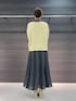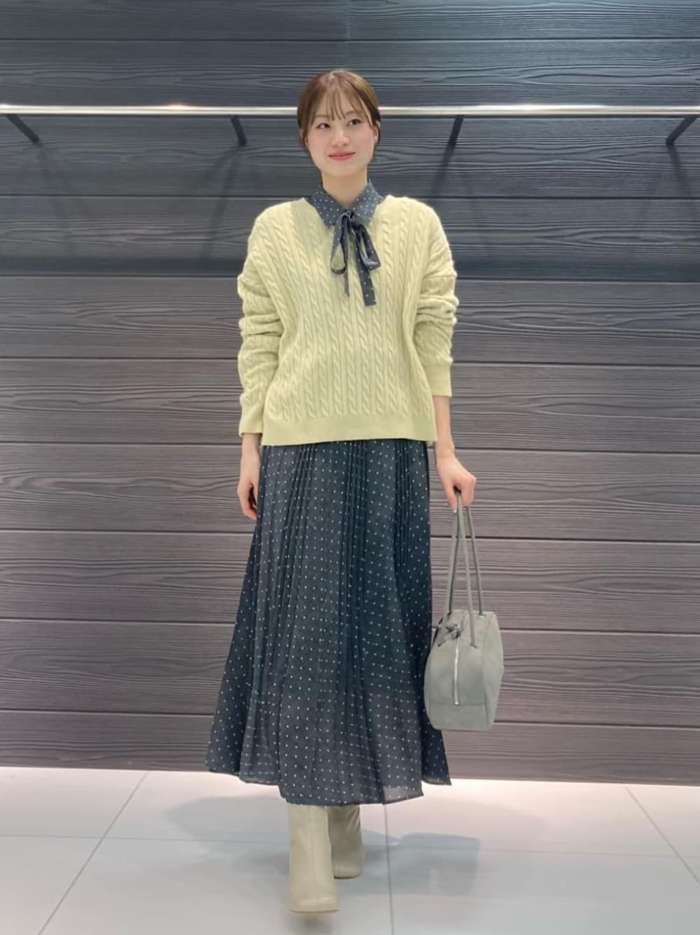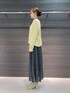 ・ニット 着用サイズ F 【サイズ感】 シャツインできるくらいのゆとりがあります。 身幅は少し広めです。 【素材感・着心地】 アンゴラ混で柔らかさと起毛感があり、軽い着心地です。 ・ドットシャツ 着用サイズ 9号 【サイズ感】 身頃と袖はゆとりがあるので、1枚でも着やすいです。 【素材感・着心地】 ポリエステル100%なので、さらっとした生地感で、軽い着心地です。 ・ドットスカート 着世サイズ 9号 【サイズ感】 ウエストゴムで楽に着用できます。 【素材感・着心地】 細幅と太幅のアコーディオンプリーツで動きがでて、ドット柄が華やかです。