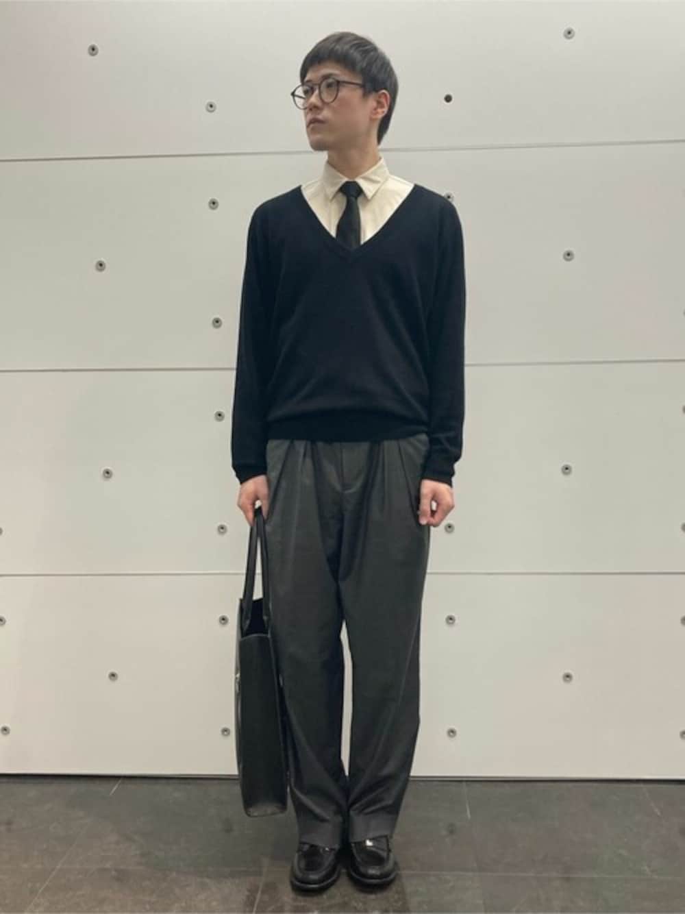 ハイゲージニットとスエード調のシャツを合わせたコーディネートです。 ニットはコムサメンオリジナルの原料を紡ぎ染色したこだわりの糸を使用しています。 デザインもプレーンな印象ですが、深めのV襟が目を惹きます。また袖口と裾にワンポイントデザインをあしらっているので一枚で着てもシンプルになりすぎません。 また素材はウール100%ですが、手洗いでもお手入れしていただけます。 シャツは両面を微起毛したジャージ素材で、スエード調の生地になっています。自然なドレープ感もあり、一枚でもエレガントな雰囲気です。また心地よい肌触りと高い伸縮性によって着心地も抜群です。 コーディネートは、シンプルですがニット・シャツ両アイテムの個性をうまく引き立てられるようなコーデになっています。 深めのV襟ニットはシャツをインナーにし、ネクタイを合わせることでカジュアルながらスマートな印象に。またインナーのシャツもスエード風の生地のものを選ぶことで地味になりすぎません。ワイドパンツを合わせればほどよい抜け感のあるスタイリングになります。 ニット、シャツ共にビジネスカジュアルにもお使いいただけるようなアイテムになっているので、ぜひ幅広いシーンでお使いください。