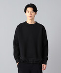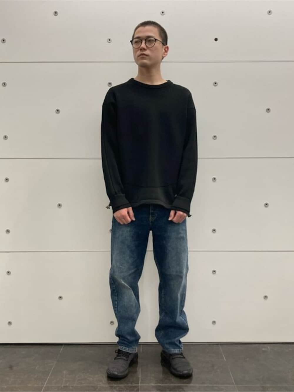 片畔スポーティニットを用いたスタイリングです。 素材はポリエステル糸を使用。12ゲージという細い糸を緻密に編み込んだニットなので、柔らかく、艶やかな生地感になっています。 デザインとしては、立体感のある編みと袖、裾のフェイクレイヤードが特徴です。裾にはスピンドルがついていますので、絞ることでシルエットもパターンを作れます。そのため1枚で着てもコーディネートがしっかりきまります。 着用するとしっかりとした生地感を感じますが、ポリエステル特有のリラックスした着心地なので、スウェットのように着ることができます。 ニット1枚にデニムと、シンプルなスタイリングでまとめました。174センチ普通体型でサイズはMサイズを着用しています。 トップスはβメンならではのゆとりあるサイズ感なので、パンツも画像のような大きめのデニム、またはジャージパンツなどがオススメです。ベルトを垂らしてもよりカジュアルな印象のコーディネートにまとまると思います。