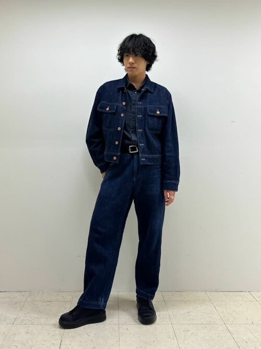 βメン デニムセットアップのコーディネート ブルゾンは、Gジャンのディテールを取り入れつつも、ショート丈と少しボリュームのある立体的なカーブの袖は、単なるビッグシルエットではない、βにしかない絶妙なバランスが新鮮な一枚です。 パンツは裾にかけて緩やかに絞られたテーパードラインと、腰から裾にかけて巻き込むように入れた脇線の絶妙なシルエットが特徴なワイドパンツになっています。 シャツはコムサメンのゆったりとしたシルエットのレギュラーカラーシャツです。 超長綿の肌触りの良さと、ライトオンスデニムの軽さが合わさることで、一日中着用しても快適に着られます。