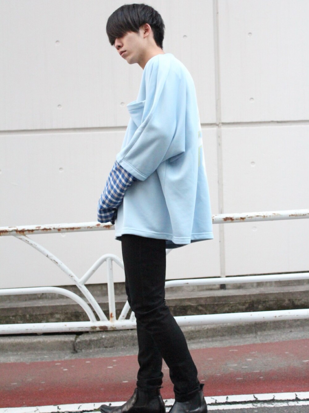 ブルー系のTシャツ/カットソーを着用したメンズの春コーディネートの1枚目の写真