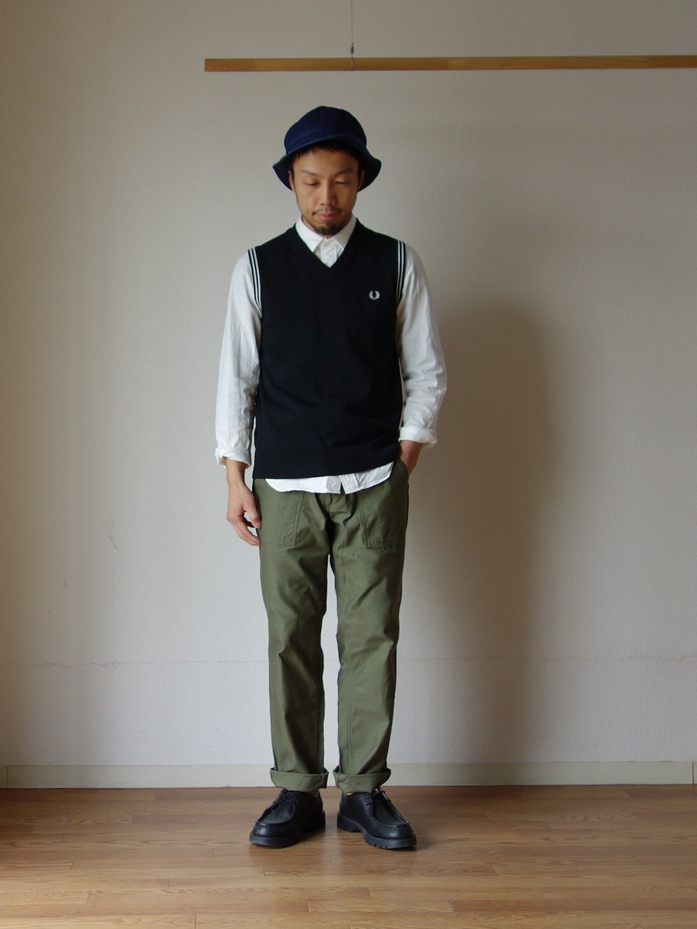 comoda上西猛夫のタンクトップ「FRED PERRY フレッドペリー F3147 COLOURED TANK コットンVネックベスト BLK ブラック」を使ったコーディネート