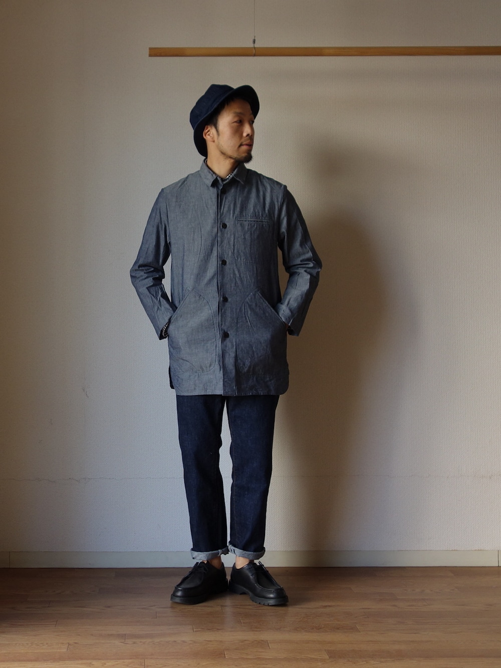 comoda上西猛夫のカバーオール「nisica ニシカ DHANGARHI COVERALLS ダンガリーカバーオール NVY ネイビー」を使ったコーディネート
