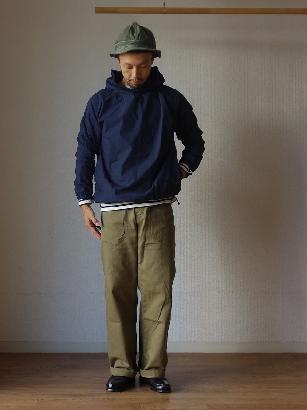 comoda上西猛夫のマウンテンパーカー「MANUAL ALPHABET マニュアルアルファベット MA-J- 123 TYP SHIRT PARKER タイプライターシャツパーカー NVY ネイビー」を使ったコーディネート