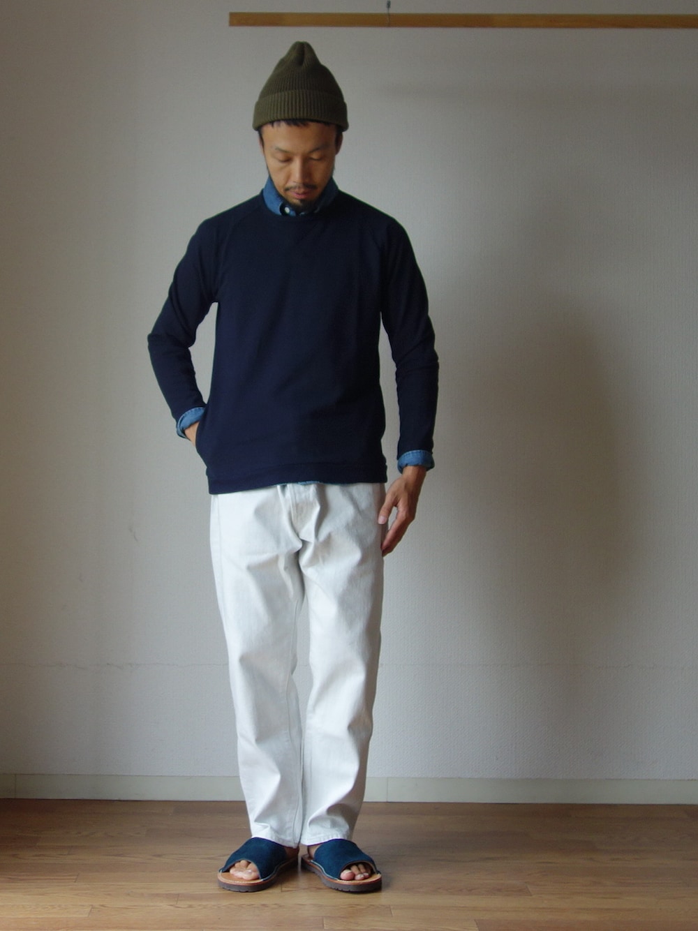 comoda上西猛夫のTシャツ/カットソー「Re made in tokyo japan アールーイーメイドイントーキョージャパン NARROW RIB POCKET TRAINER ナローリブポケットトレーナー ネイビー」を使ったコーディネート