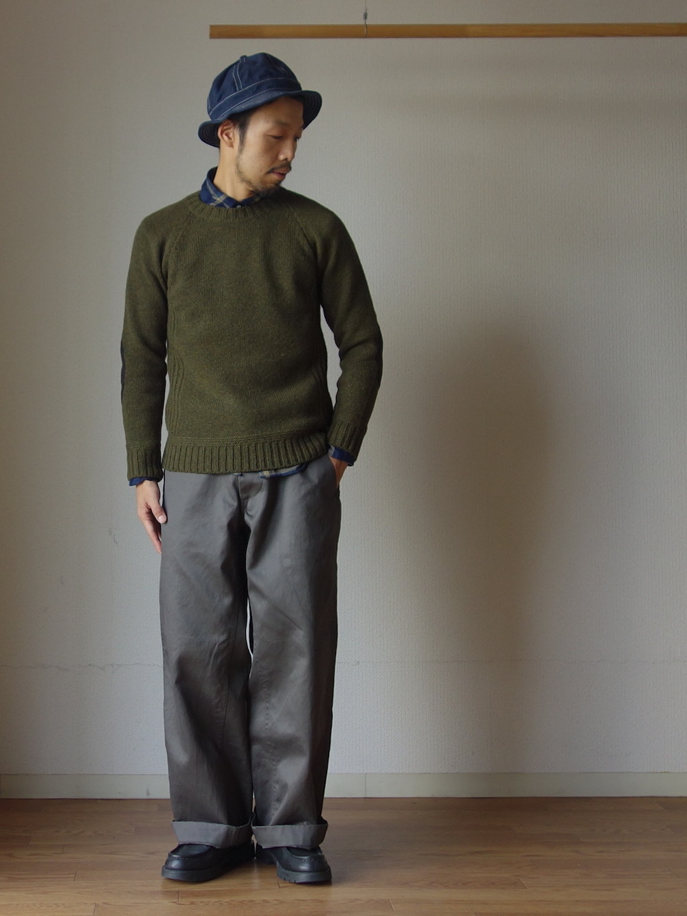 comoda上西猛夫のニット/セーター「【ラスト1点!】SOGLIA LANDNOAH SWEATER KHAKI ソリア ラドナーエルボーパッチ ラグラン クルーセーター カーキ」を使ったコーディネート