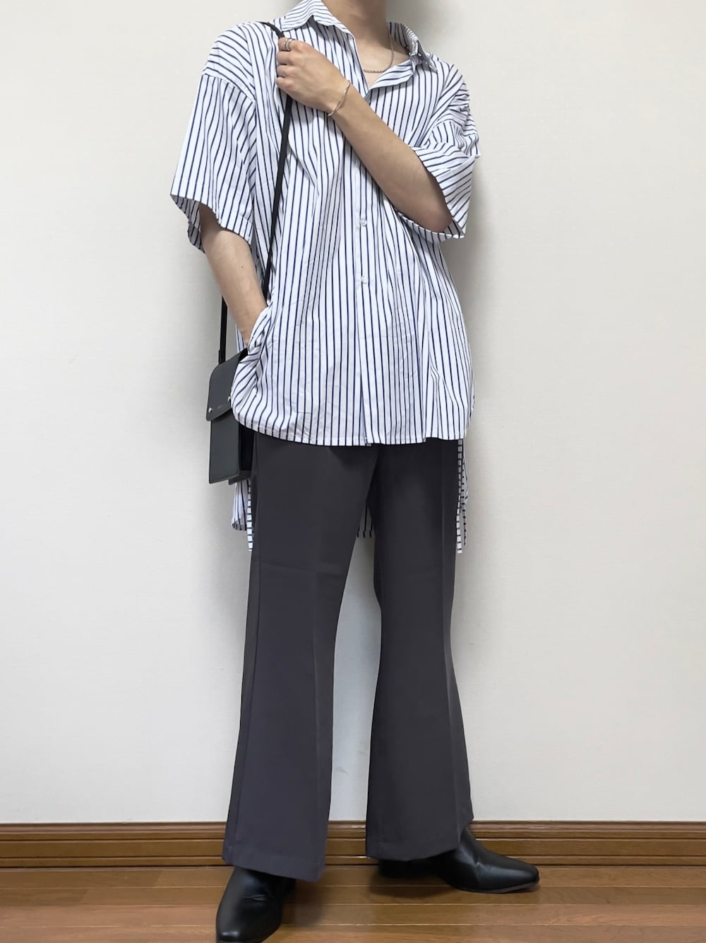 ご覧頂きありがとうございます! よろしければいいね、save、フォローお願いします! 今回は爽やか×モードコーデです! ストライプはやはり夏にはぴったりですな🔥 身幅広めのシャツとフレアパンツはめっちゃ相性良いので、皆さんも是非やってみて下さい😎