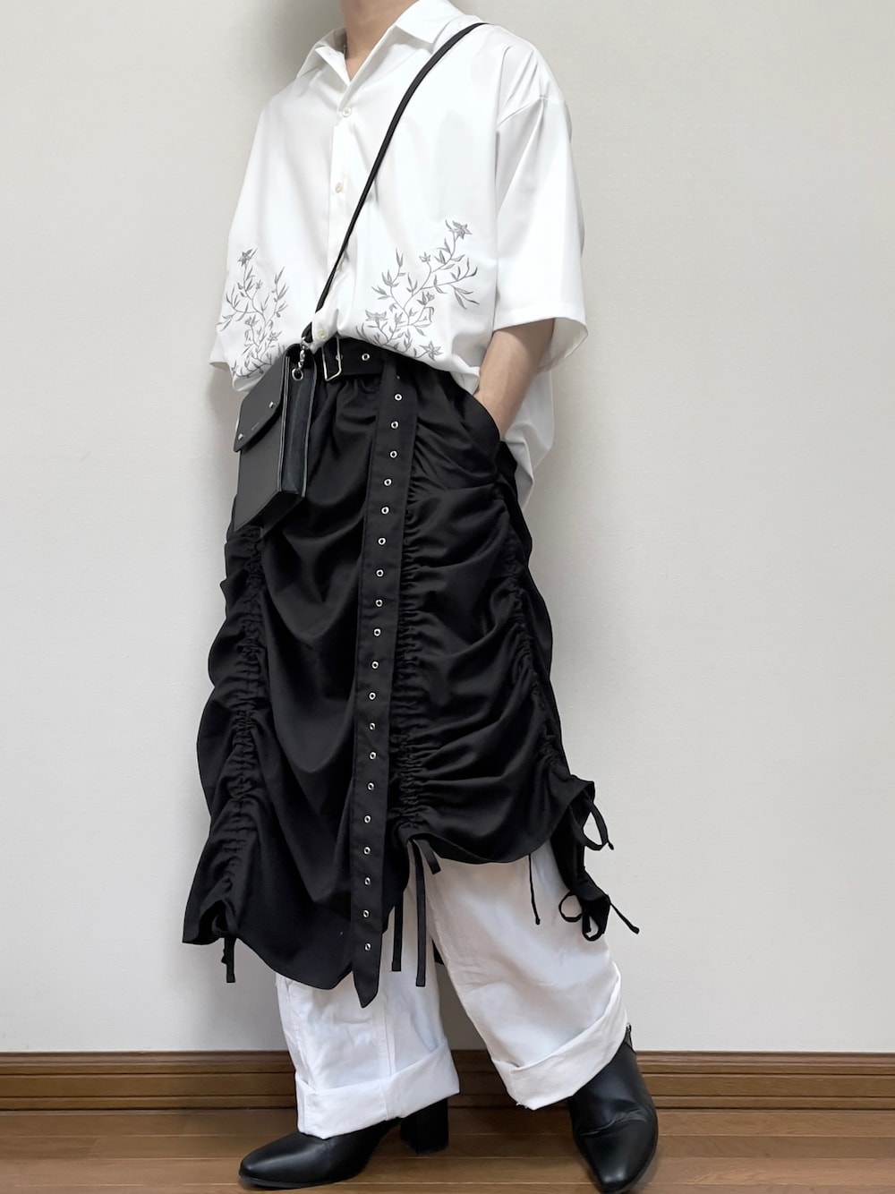 ご覧頂きありがとうございます! よろしければいいね&フォローお願いします! 今回は超前衛的なモノクロコーデです! 本当に白と黒のアイテムのみで統一してます! やはりスカートが使いやすくて良きですな👍
