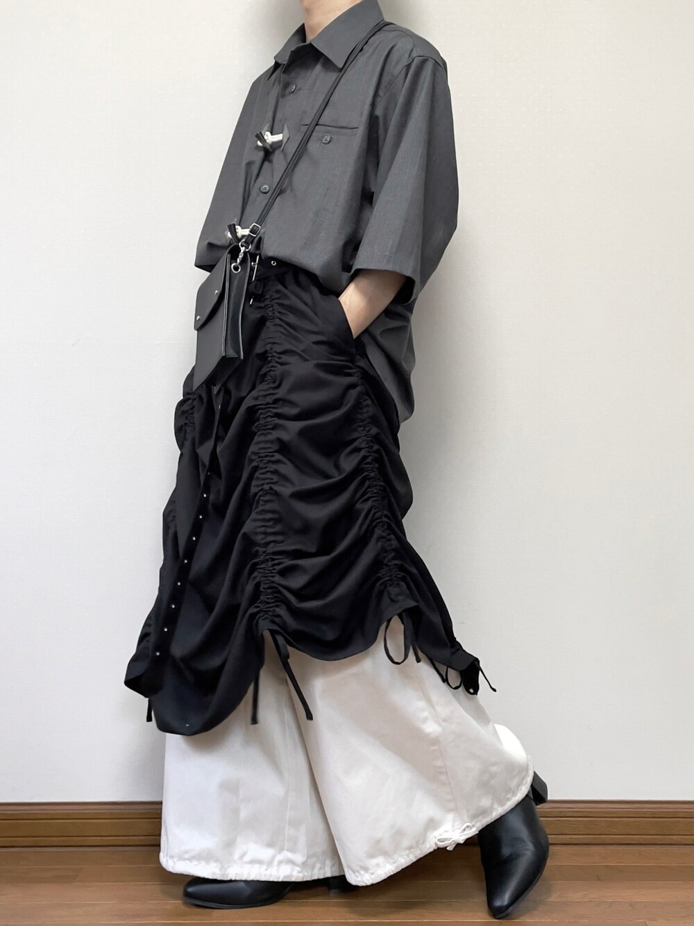 ご覧頂きありがとうございます! よろしければいいね&フォローお願いします! 今回は前衛的なモードカジュアルコーデです! モノトーンの色彩でまとめてるのですが、シャツやスカートのデザインでガッツリ前衛的なコーデにしてみました👍 このスカートと白袴の組み合わせが個人的にお気に入り👌