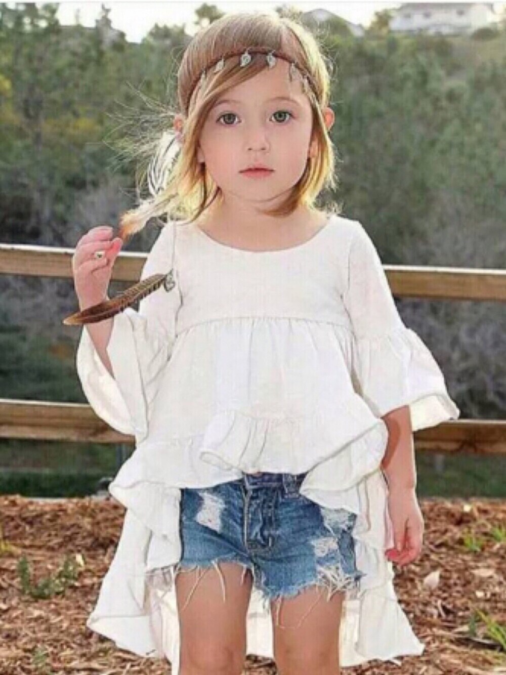 ホワイト系のチュニックを着用したキッズの春コーディネートの1枚目の写真