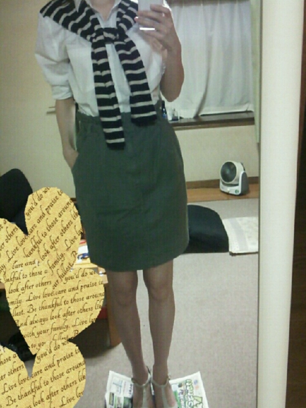 肩掛けカーディガン見せかけシャツ Heather スカート Heather パンプス MISHMASH