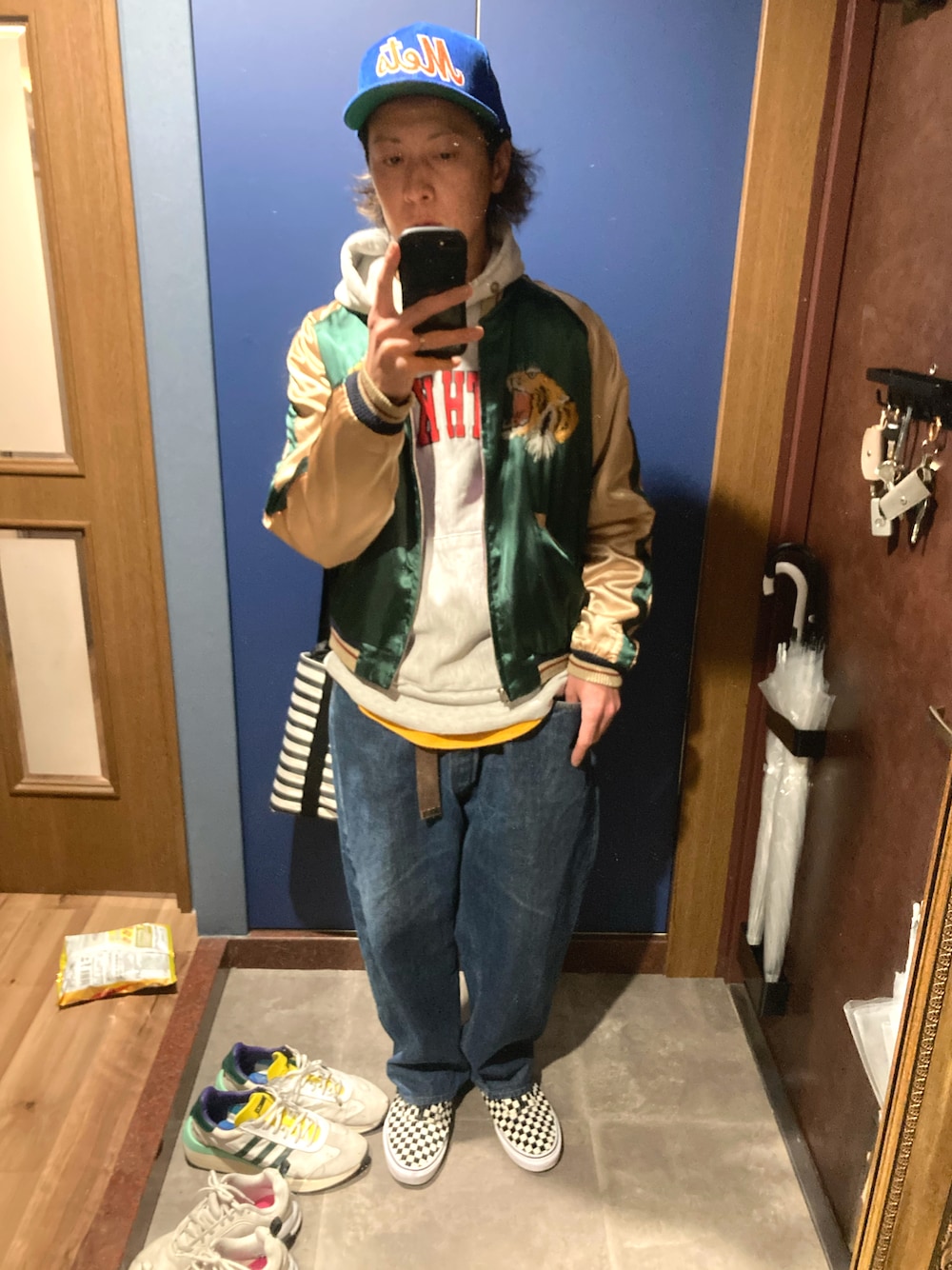 76年のリーバイス501に90年代のチャンピオンスウェットパーカーに、東洋のスカジャンで😊キャップはニューエラのコーデュロイ素材がお気に入り😊
