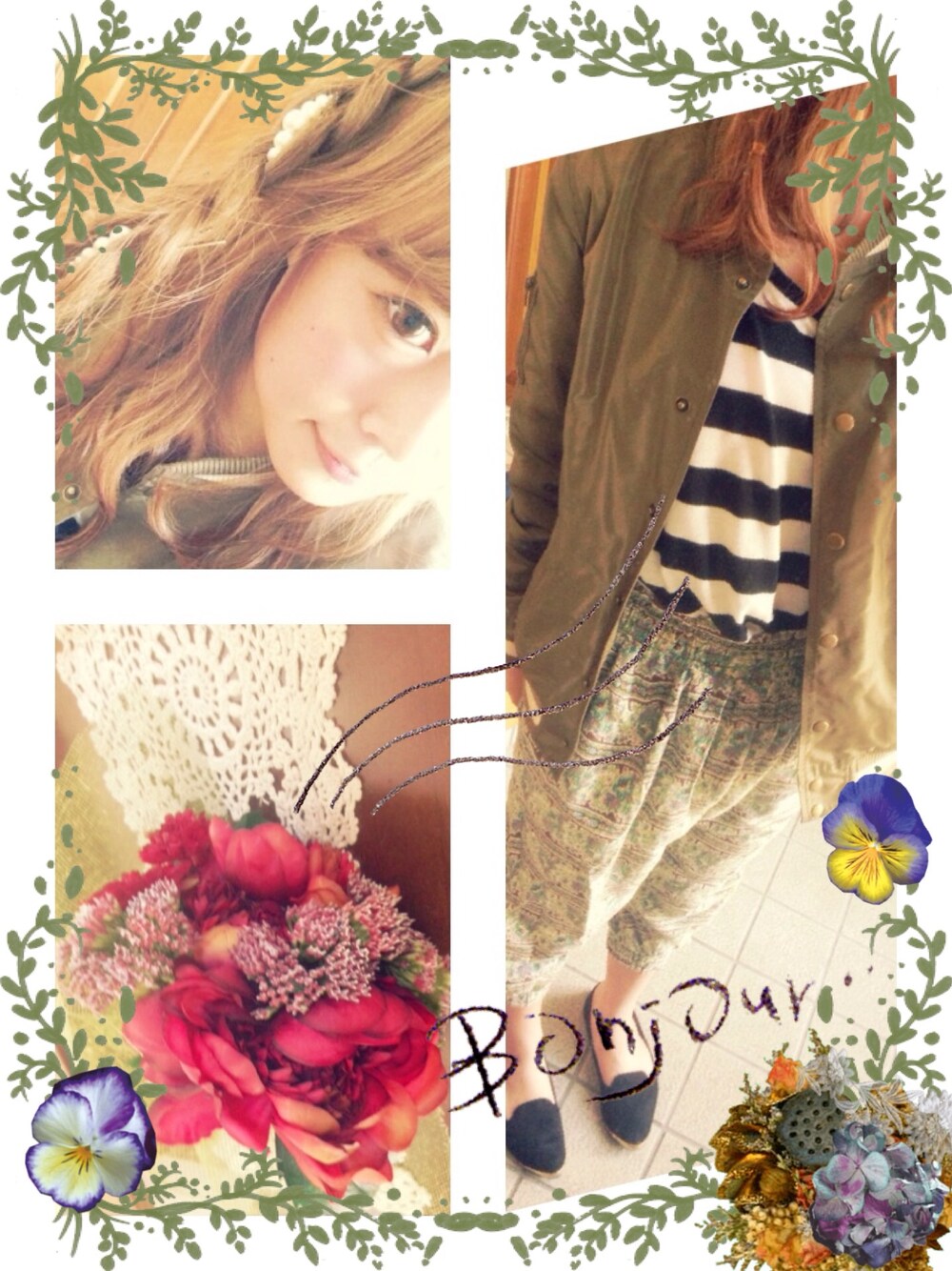 おはなのぶかぶかぱんつ🌼 スタジャン:Ray Beams ぼーだーT:MURUA はながらぱんつ:不明 ぱーるのぴん:Beams ぱんぷす:Forever21