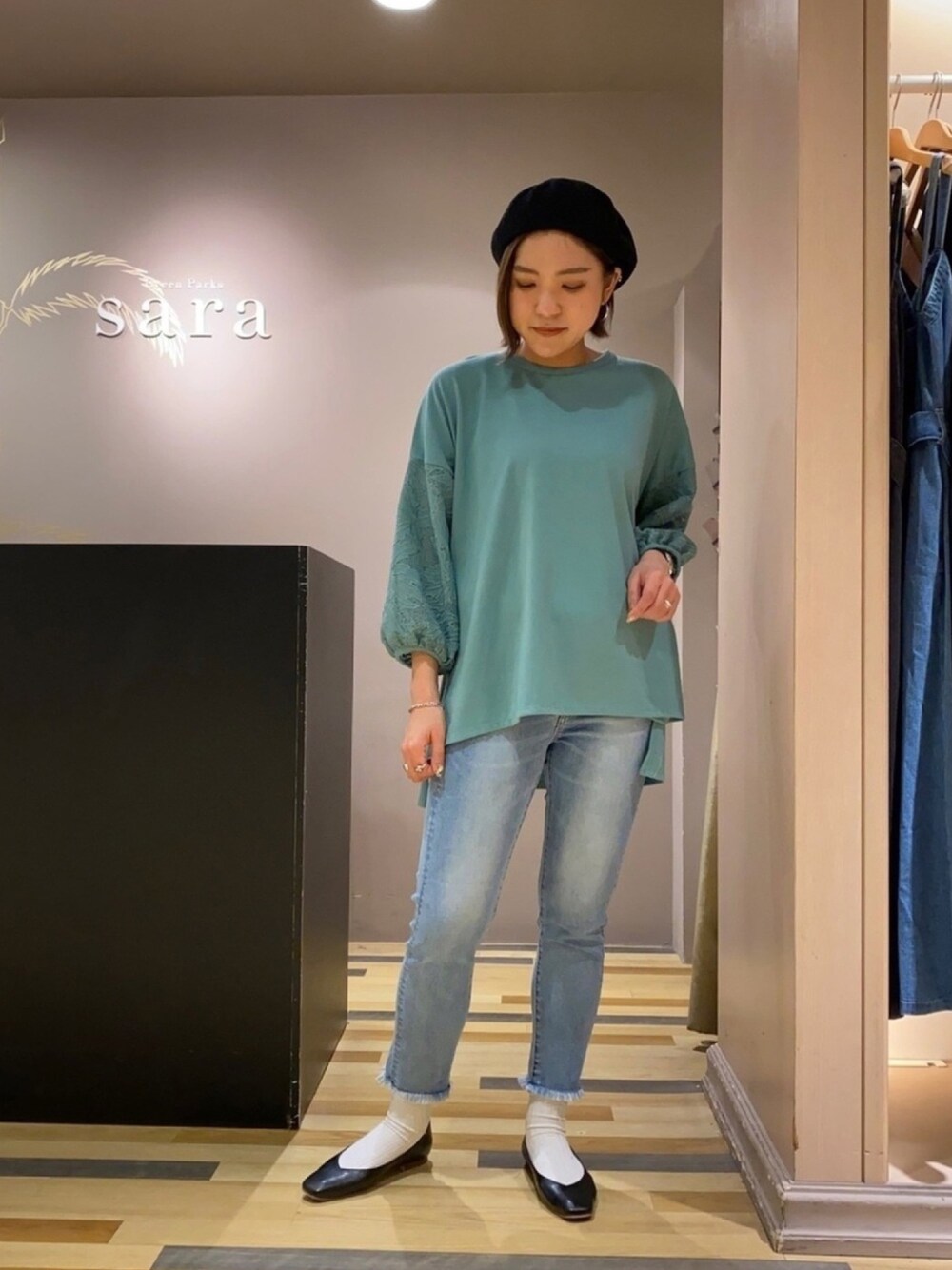 グリーンが映えるコーデ 袖の刺繍が春らしい グリーンのトップスが主役🌱 薄めカラーのデニムと合わせて、 シンプルながらも春らしく まとめました👌 袖の刺繍が可愛らしかったので、 足元も合わせて女性らしい パンプスに🥿