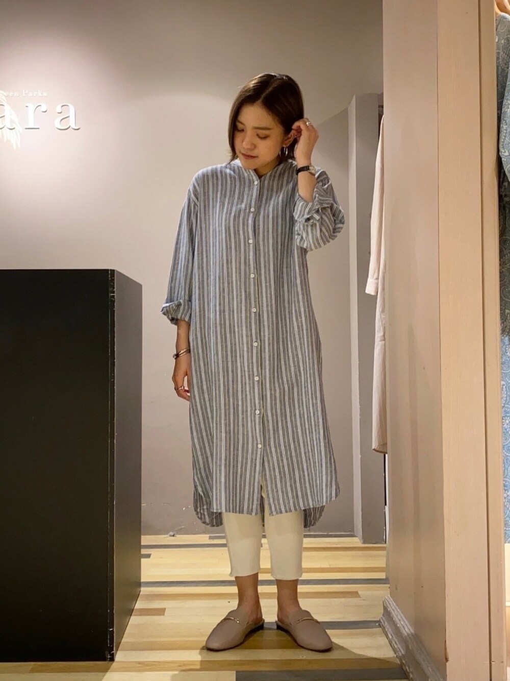 リネンで涼しげコーデ 毎年春から夏にかけて大人気! リネンアイテムが登場しました🎐 さらっとした着心地とはそのままに、 トレンドのバンドカラーで 今年らしい形となって 入荷しております👌 白のボトムスと合わせて、 少し先のシーズンを先取りすると お洒落さんなイメージ◎ アイテム的にはメンズライクですが シャツは袖をロールアップ、 ボトムスは9分丈で手首&足首を見てせ 女性らしい着こなしにしました😉💕
